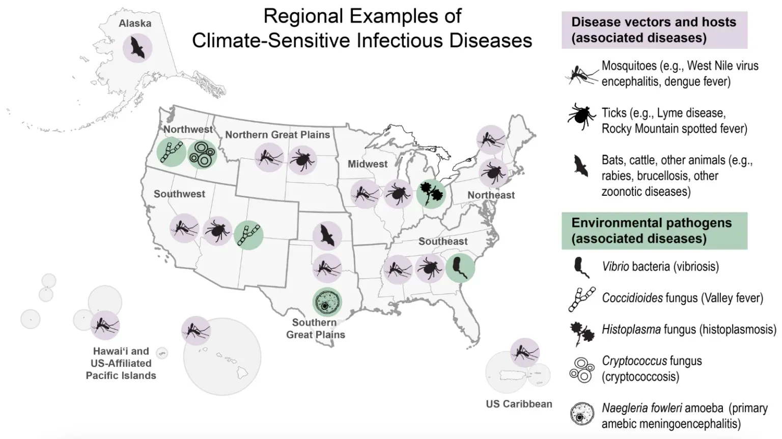 The United States' Fifth National Climate Assessment warns that infectious diseases are spreading because of the warming climate and this is a handy little map for that piece of horrible news. [Grist]