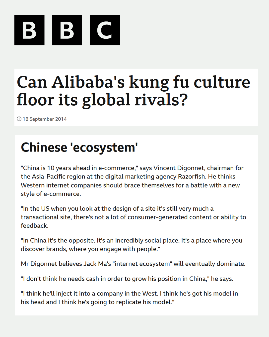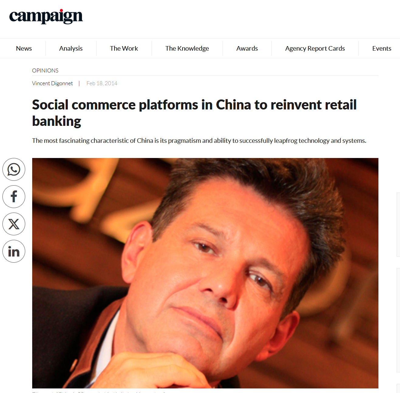 Digital agency Razorfish's APAC CEO was keen to highlight the digital innovations he was coming in contact with through their China office. As Head of Communications for China, I collaborated with the Global Communications team to establish news hook monitoring systems and transform the CEO's message into a variety of pitches towards media.